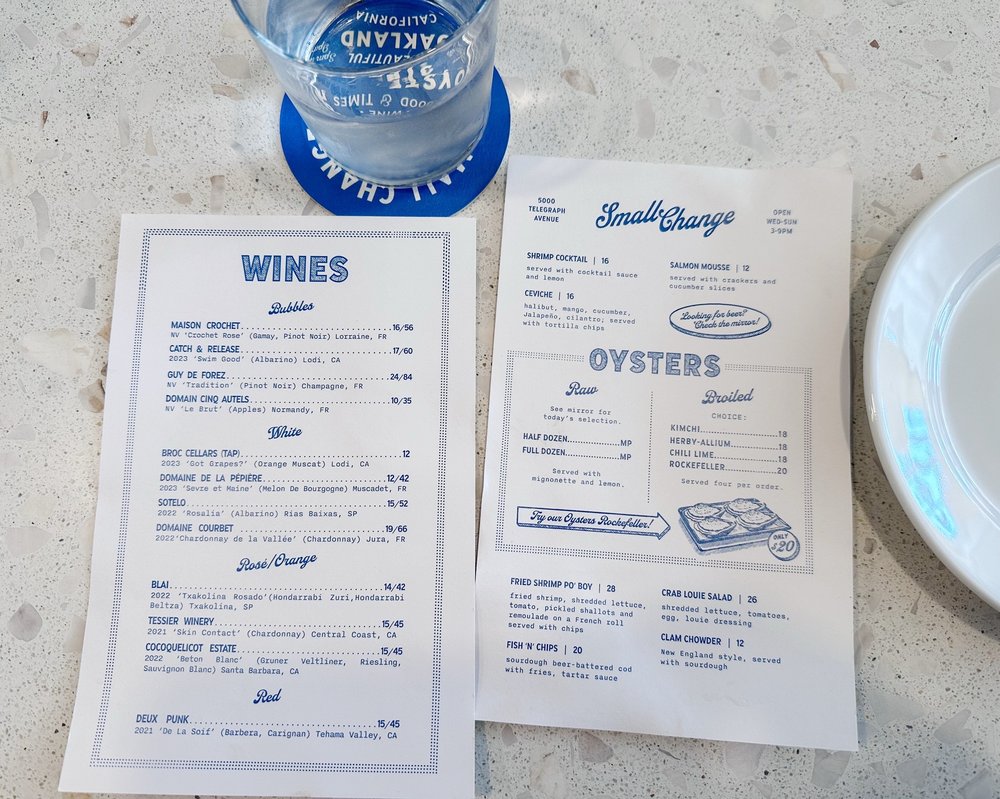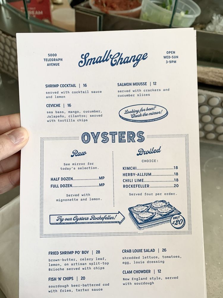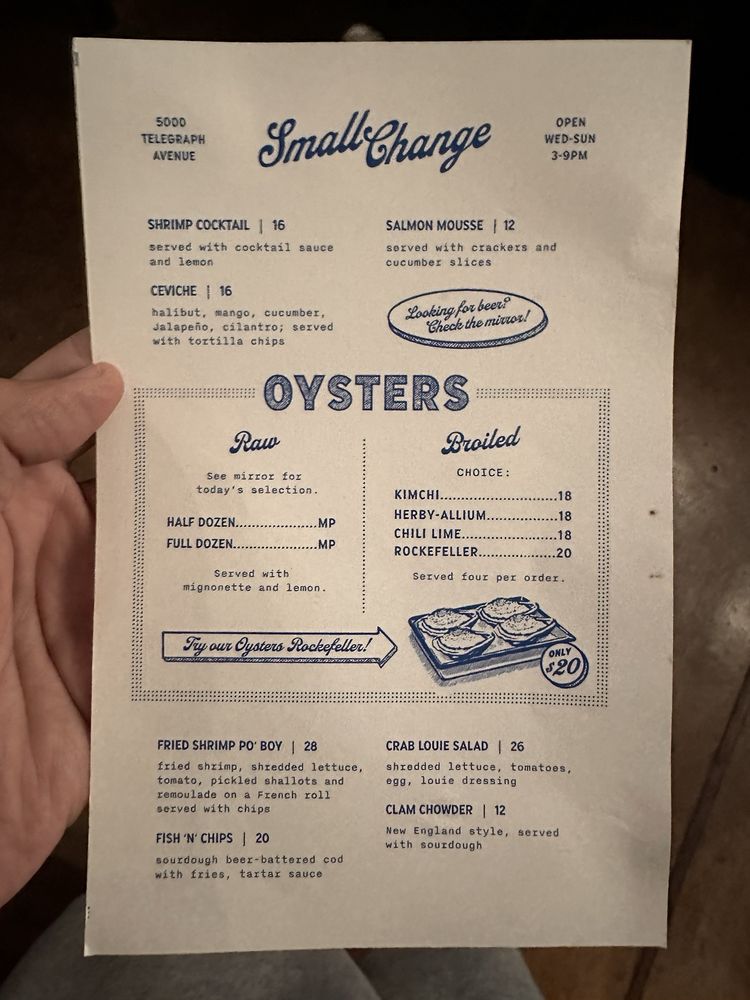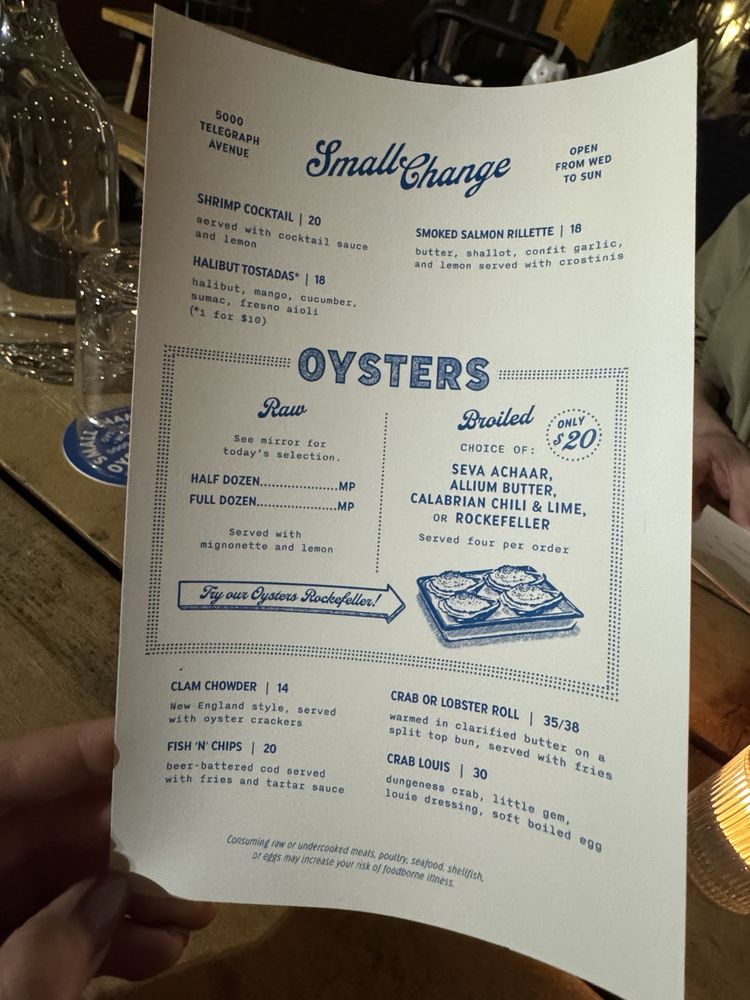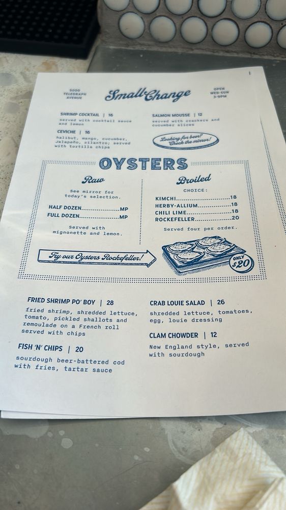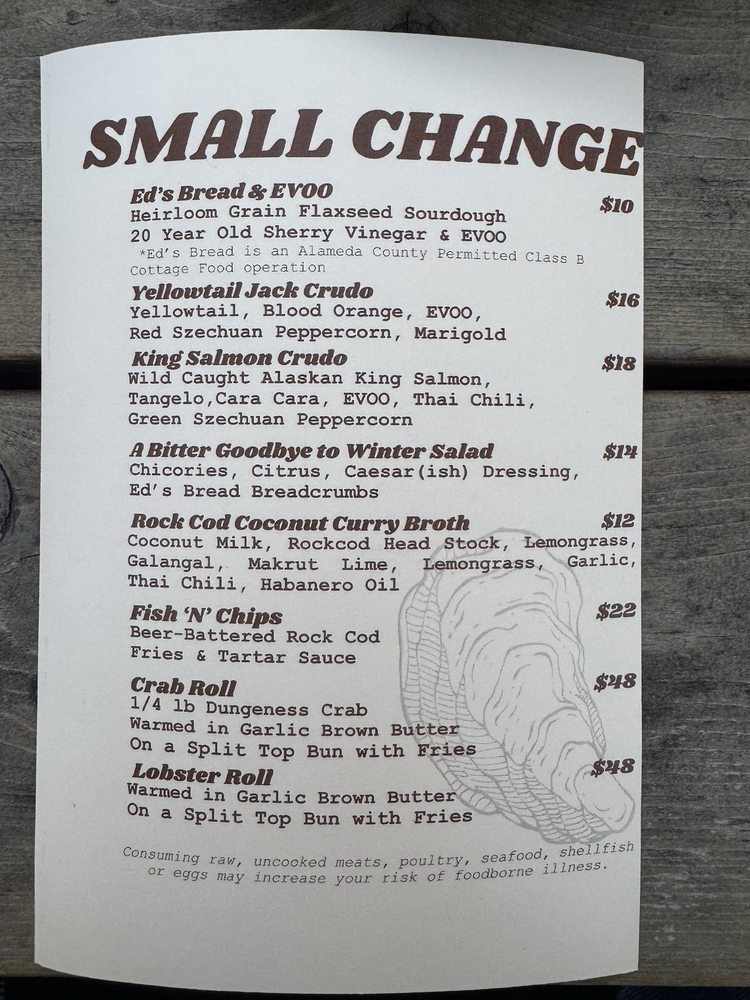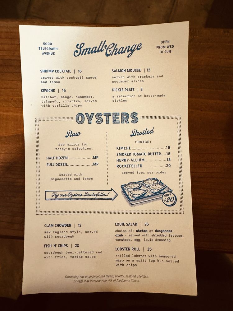 Welcome to Small Change Oyster Bar, a delightful seafood haven nestled in Oakland's Temescal neighborhood. This unclaimed wine bar offers a thoughtfully curated menu, where both raw and broiled oysters shine. Diners can indulge in exquisite selections like the Kimchi Broiled Oysters ($18) and seasonal specialties that balance rich flavors with fresh seafood.